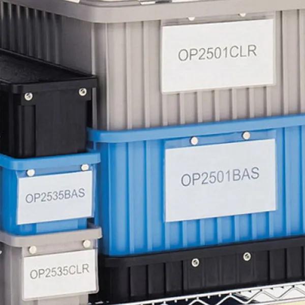 Metro OP2501BAS ESD Safe Benstat l Snap-On Card Holder for Tote Boxes includes snaps to fit all Metro totes. Static dissipative Ticket Holder includes snaps to fit all Metro tote boxes and is constructed from Blue Benstat Polyethylene. - Metro snap-on card holder for tote boxes.