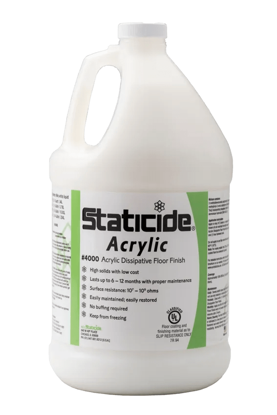 Staticide® Acrylic Floor Finish offers high-tech static protection at a reasonable price. This economical formula leaves a durable, glossy finish that can last up to twelve months, making it a popular choice for budget-minded companies with industrial areas where static control is essential. Perfect anti-static floor finish for production areas, warehousing, shipping, laboratories, and electronic repair facilities