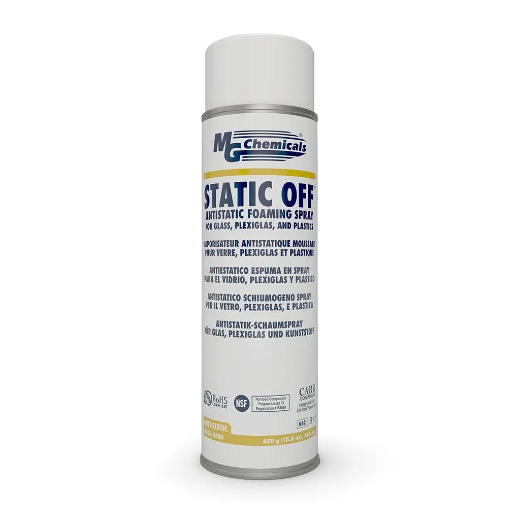 MG Chemicals' Static Off Antistatic Foaming Spray is designed to eliminate static charges and reduce dust attraction on various surfaces. Its non-streaking and non-dripping formula makes it ideal for transparent and vertical surfaces.