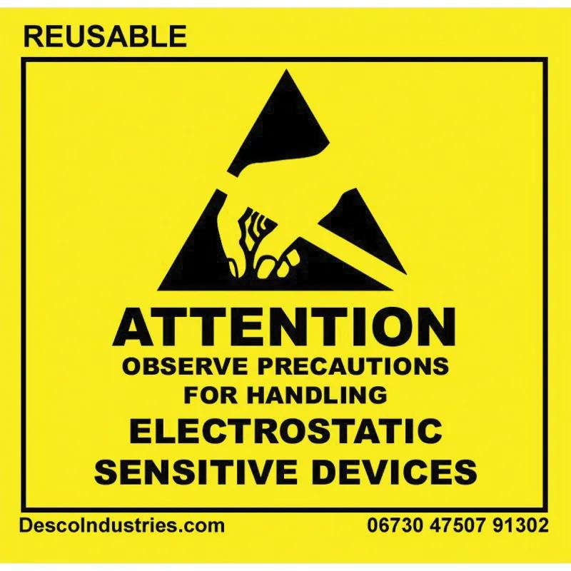 Pack500/RollDesco's ESD attention labels are designed to indicate that contents of the package with the label are susceptible to damage. The packaging must be grounded and ESD control precautions are required when opening the packaging and handling the contents. Labels with reusable adhesive will tear when removed to indicate that the package has been opened. - Labels with permanent adhesive can not be reused. Labels with reusable adhesive allow the label to be removed and not leave a residue. Labels are coated with varnish for added durability and resistance to moisture, grease, and alcohol.