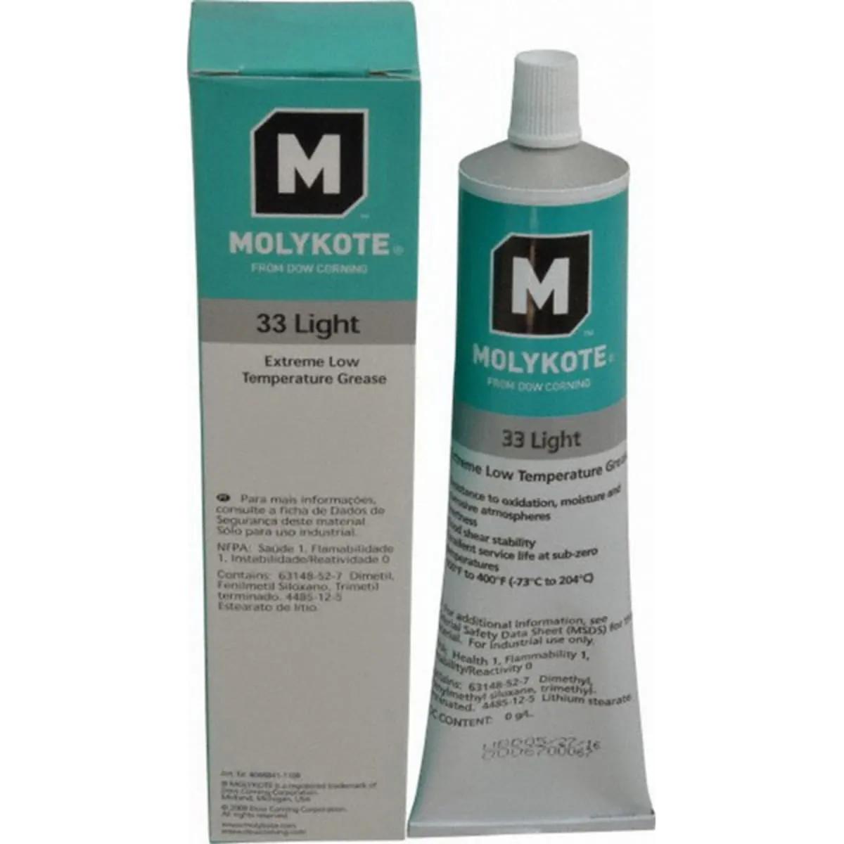 Dow Corning Molykote 33 light- extreme low temperature bearing grease off-white is a thickened silicone oil that is used for lubricating plastics, rubber, and anti friction bearings. - It is recommended for meters, plastic clock motors, freezer cart castors, low-torque instruments, and conveyor equipment. It provides good shear stability, wide service temperature range, inertness, and resistance to corrosion, moisture, and oxidation.
