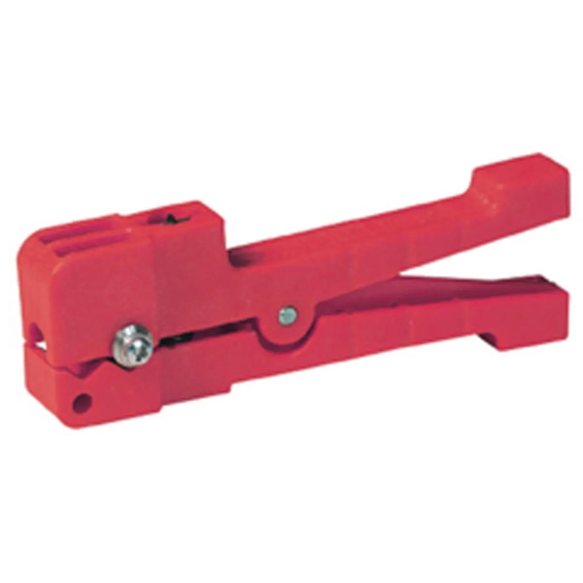 The Ideal 45-403 are red stainless steel cable strippers with straight jaws. It has a spring-loaded cutting head to hold the cable and a wire guide roller to support a stripping head alignment. - Precision stripping for most non-round shielded cable and other outer cable jackets, including extruded Teflon insulations. Spring loaded cutting head holds cable with consistently accurate tension, removing any need for adjustment.