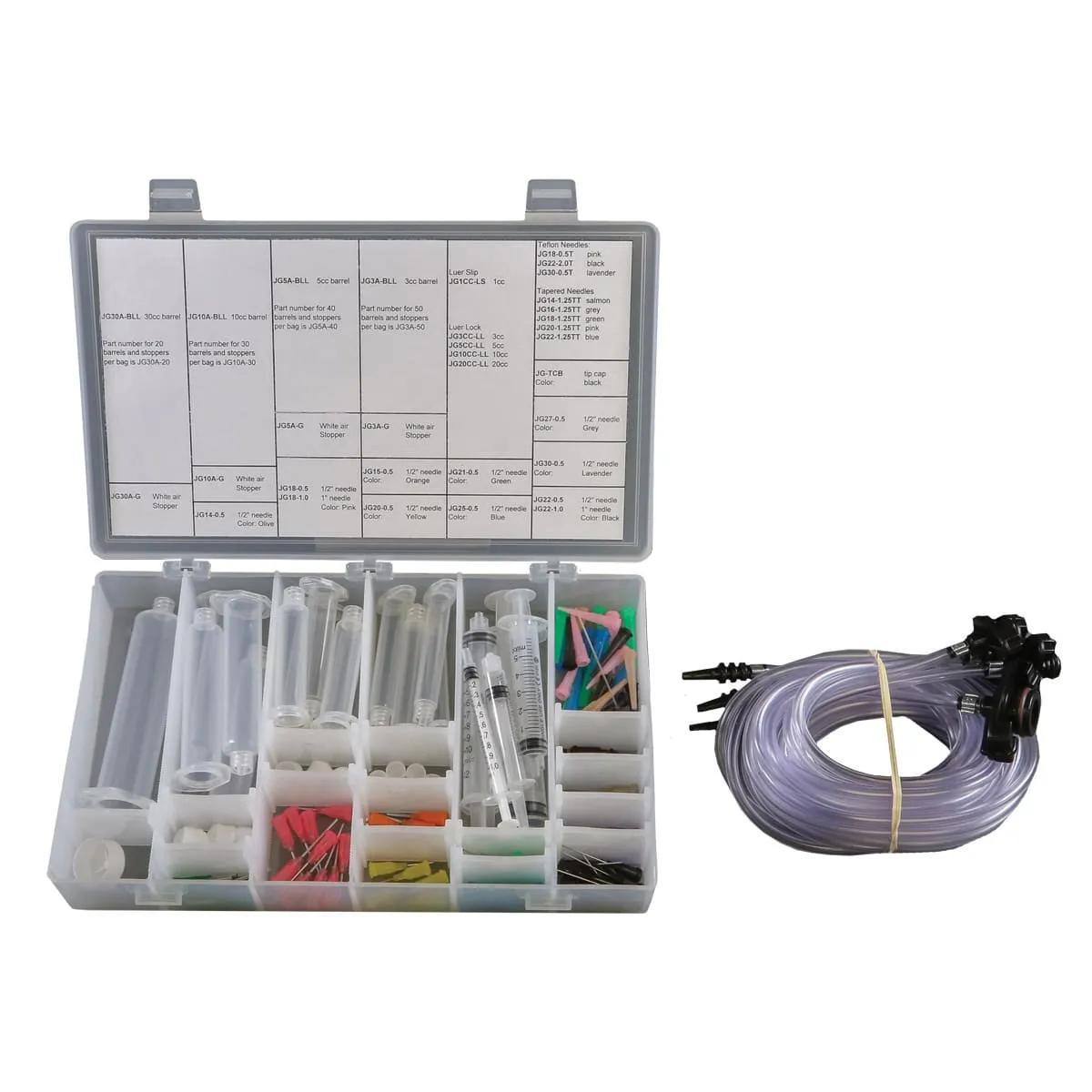 Jensen Global Dispensing Needle and Syringe Kit and Adapter. - The kit includes a 3,5,10 & 30cc standard syringe adapter, plus a variety of needles, air syringe barrels and plastic stoppers, manual syringes, and tip caps.
