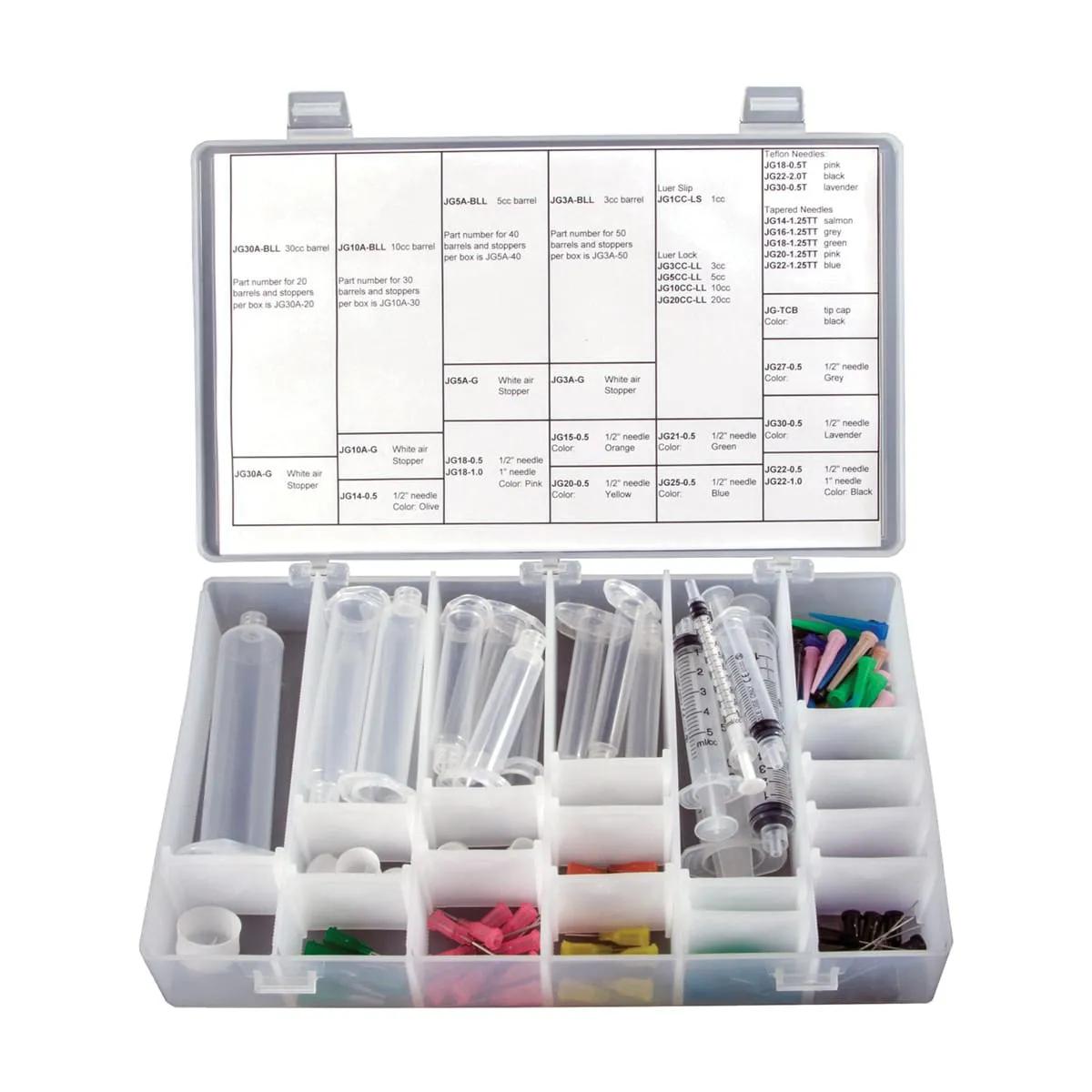 Jensen Global Dispensing Needle and Syringe Kit. - The kit includes a variety of needles, air syringe barrels and plastic stoppers, manual syringes, and tip caps.