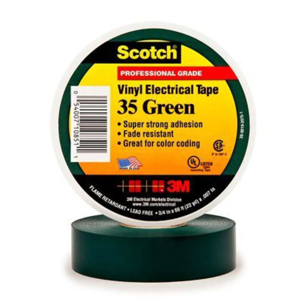 Scotch® Vinyl Color Coding Electrical Tape 35 is a 7 mil thick, premium grade, color coded electrical tape. This flame retardant tape is suitable for use in phase identification, color coding of motor leads and piping systems and for marking safety areas. This tape is 600V rated and withstands a temperature range of 32 to 221 °F (0 to 105 °C).