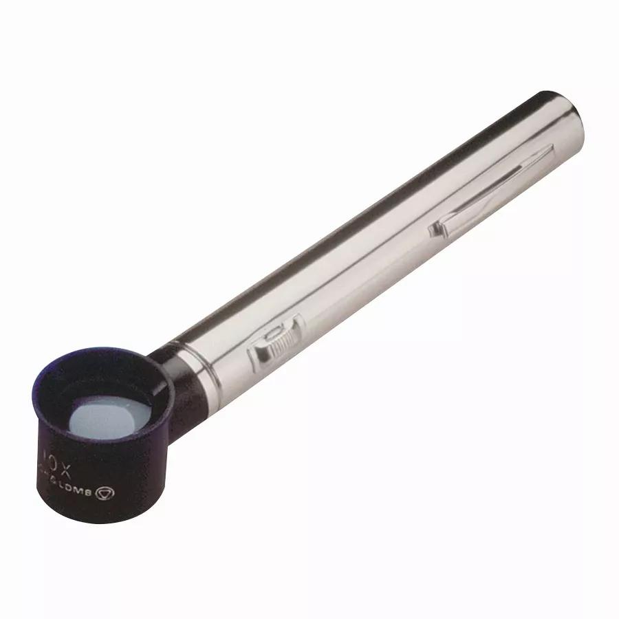 A problem sometimes encountered in using a high power magnifier is the lack of sufficient light on the object. A bulb inserted in the groove of the Coddington lens illuminates the object being examined eliminating this problem. Requires two AA batteries (not included). - Correction in the coddington magnifiers is achieved through the use of a single thick lens with a central groove diaphragm. This provides for sharp, crisp images. A little trivia "Coddington" Magnifiers got their name from their British inventor, henry coddington.