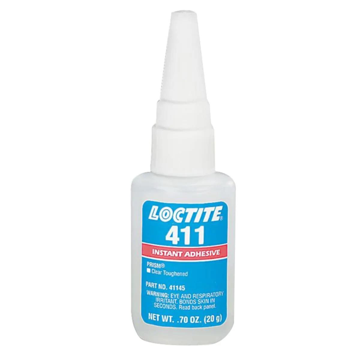 Loctite 411 prism high viscosity, clear, toughened, one-part, room temperature cure, instant adhesive designed for impact and peel strength in gap filling OEM assembly applications. - Loctite 411 is a general purpose gap filling adhesive suitable for bonding rubber, plastic and metals. Loctite 411 exhibits excellent peel strength and added heat resistance.
