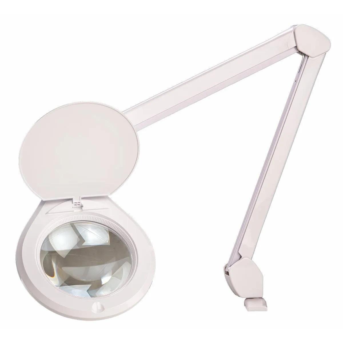 The Accu-Lite® LED magnifier is in a class by itself. A touch sensitive on/off switch adjusts brightness. Hidden springs and a 360° swivel lamp head allow you to fine-tune the magnifier’s positioning for inspection at any angle. With its built-in protective cover, optical grade glass lens, and an ESD protective coating (black models only), the Accu-Lite® LED magnifier offers uncompromising value for clean rooms and anywhere else precision inspection is required. - Accu-Lite™ 6 Inch Round LED Magnifier with option of 3.5 Diopter and 5 Diopter lens, Specialized Touch Membrane Switch Controls Power & LED Dimming, 5000K Color Temperature. All Models Include Lens Shield Standard, White Optical Quality Glass Ensures Fatigue-free Performance. Table Edge Clamp 45" Reach with Hidden Internal Springs for Cleanroom wipedown. 120V, Black or White Finish