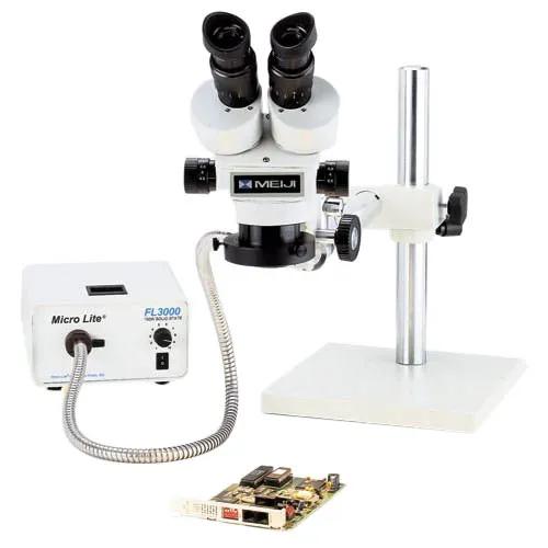 Meiji Stereo-Zoom Binocular Microscope System featuring 3.5 - 45X Standard Magnification (up to 210X with options) 10X Eye Pieces and 0.5X Lens for increased working distance, Heavy duty Ball Bearing arm base Assembly. Ships with Micro-Lite FL3000-A Annular Ring illuminator. - The O.C. White Meiji Stereo-Zoom TKMZ Binocular Microscope with crisp, high resolution, precision optics providing excellent, erect, unreversed stereoscopic viewing includes wide field 10X eyepieces, focusing arms that utilize a special 20 mm drop arm for added articulation and all ESD Safe lighting and bases.