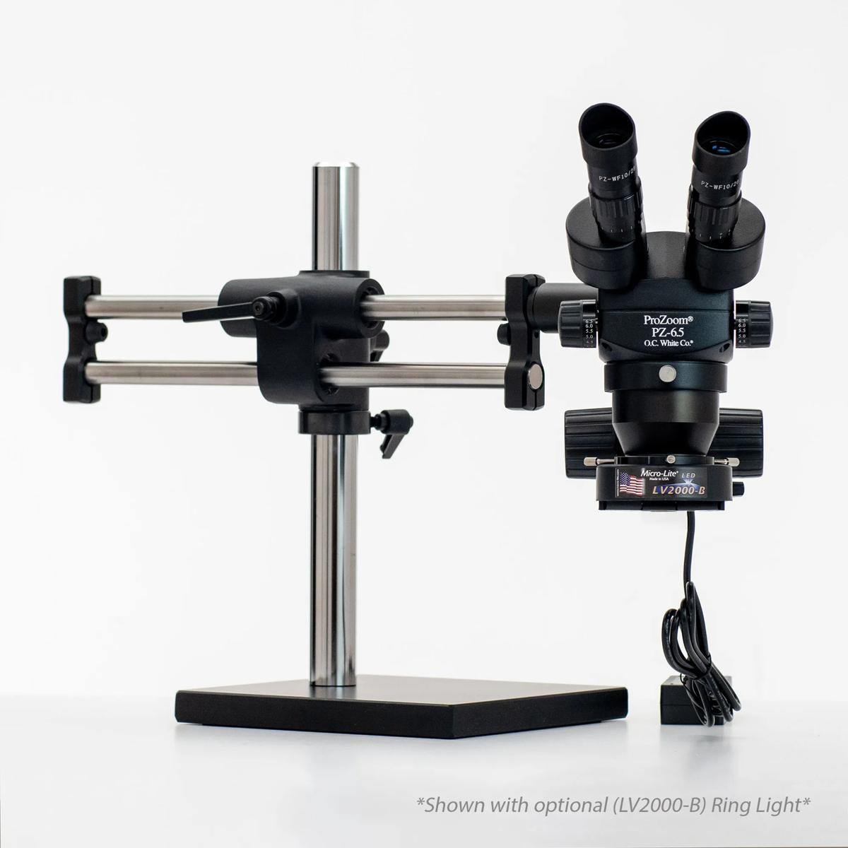 ProZoom® 6.5 Stereo-Zoom Microscope with Exclusive Detented Zoom Stops. Super-Wide (28mm) 10X Eyepieces. Standard Range 5-65x (up to 390X with optional parts). 16" Tall Ball Bearing Base, Easy 360° main body rotation. 190mm working distance. 0.5X Auxiliary Objective Lens at no charge ($125 value). ±6 Diopter Adjustable eyepieces to correct individual eyesight variations. 45° Eyetube inclination. ESD Safe Standard. Micro-Lite® LV2000-B LED Ring Light
