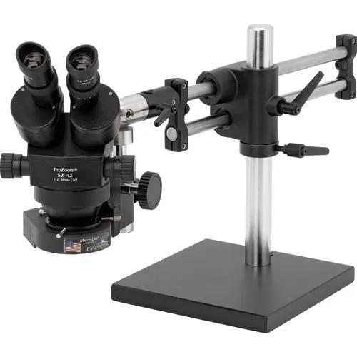 ProZoom® 4.5 Stereo-Zoom Microscope. Extra-Large (22mm) 10X Eyepieces. Standard Range 7-45X (3.5 – 225X with optional parts). 16" Tall Ball Bearing Base, Easy 360° main body rotation. 90-250mm working distance. 0.5 Auxiliary Objective Lens at no charge ($125 value). ±5 Diopter Adjustable eyepieces to correct individual eyesight variations. 45° Eyetube inclination. ESD Safe Standard. Micro-Lite® LV2000-B LED Ring Light