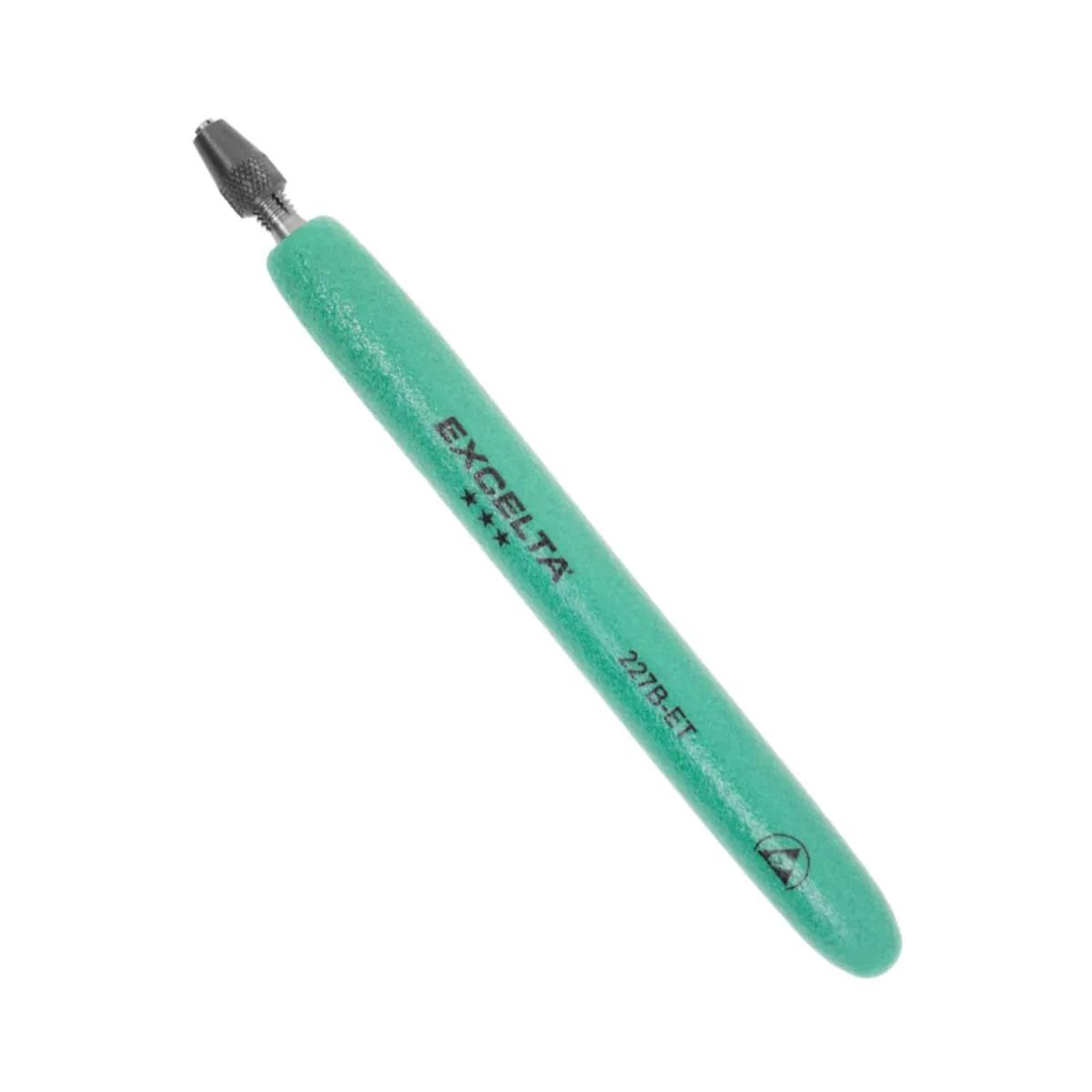 The brass handle pin vise has chuck and has an ESD-safe (10^10 Ohm/sq) ergonomic foam grip for comfort and ESD protection. - Excelta Straight Single End Pin Vise, Material: Brass Handle, Handle Type: Ergonomic Foam, Cushioned Grip.