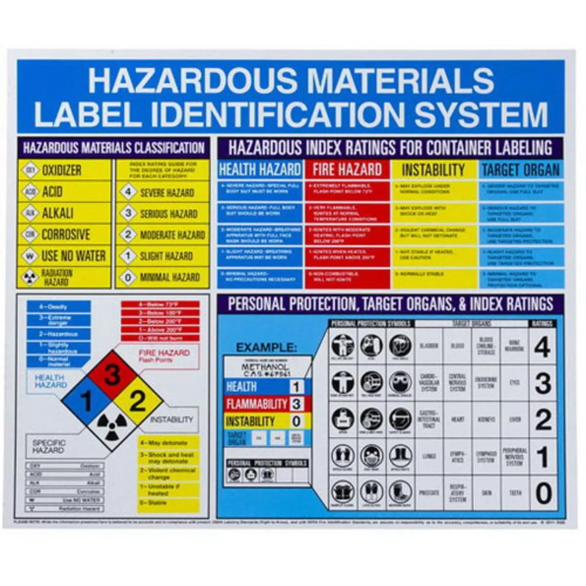 Labeling hazardous materials correctly is critical, so help employees understand the proper methods using hazardous material poster. Made of flexible plastic for added durability. Brady Poster, Width: 26 Inch, 22 Inch Height, Legend Style: Text and Symbol, Legend: HAZARDOUS MATERIALS LABEL IDENTIFICATION SYSTEM - ETC, Language: Spanish, Legend/Background Color: Black, Red, Blue, Yellow on White, Material: Plastic, Rectangle Shape.
