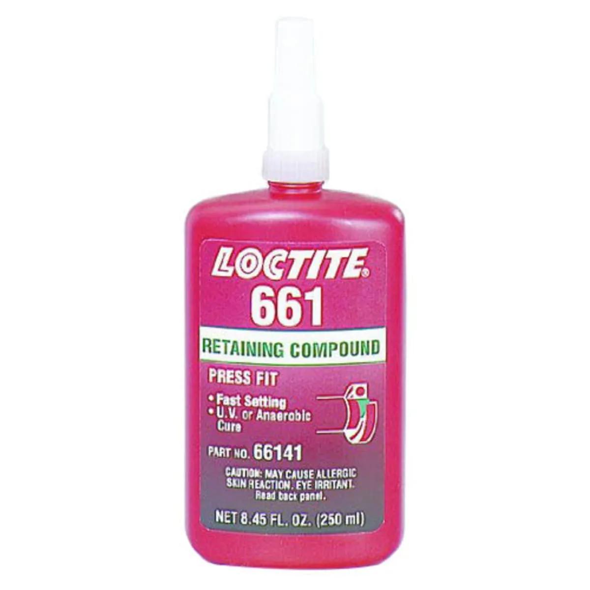 Loctite 661 cures when confined in the absence of air between close fitting metal surfaces. Loctite 661 is designed for the bonding of cylindrical fitting parts, particularly where strength at elevated temperatures is required. Loctite 661 retaining compounds are typical used in holding gears and sprockets onto gearbox shafts and rotors on electric motor shafts.