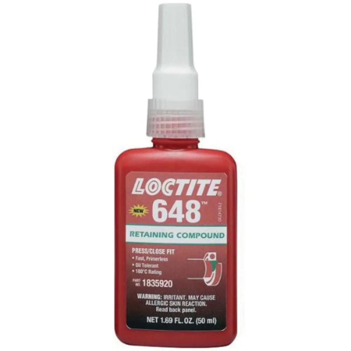 Loctite 648 high strength, rapid cure retaining compound performs best for clearance or interface fit parts. Excellent performance for dynamic, axial and radial loads. Bonds through contaminants including oils, cutting and corrosion protection fluids. Cures on metals without an activator. - Loctite 648 is designed for the bonding of cylindrical fitting parts. The product cures when confined in the absence of air between close fitting metal surfaces and prevents loosening and leakage from shock and vibration.