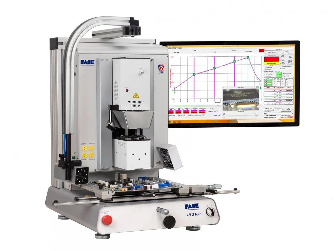 The PACE IR 3100 Infrared BGA Rework Station offers precise, non-contact heating for the rework and repair of BGAs, SMDs, and PCBs. Designed with programmable temperature profiles, closed-loop PID control, and auto-cooling safety features, it ensures safe, reliable, and repeatable rework processes. Ideal for professional electronics manufacturing, repair, and prototyping environments.
