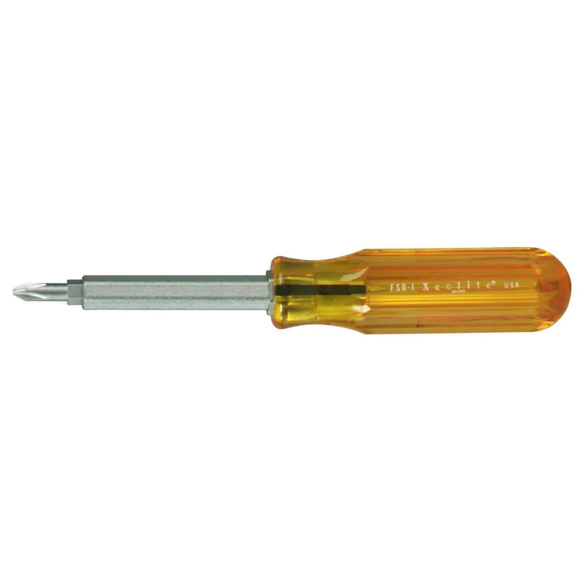 Xcelite FSD1 is extra handy four-in-one screwdriver. It features self-storing standard shaft. 2 blades also interchangeable with Two-In-One, converts in seconds to 4 most often needed tips. - Xcelite 4-in-1 Screwdriver, Length: 7.25 Inch, Tip Size: 0.1875 Inch/0.25 Inch, #1, #2, Round Shank, 0.4375 Inch Shank Dia, 3.0625 Inch Shank Length, Tip Type: Phillips, Slotted.