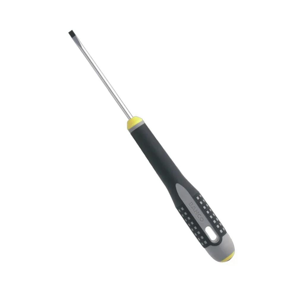Bahco slotted Ergo screwdriver with ergonomically developed 3-component handle that provides comfort and maximum grip even with oily hands. Blade is fine polished and bright chrome plated, entirely hardened. Black oxide tips prevent chipping of chrome to reduce possible contamination at work location. - Screwdriver developed according to the scientific ergo process. Color coded handles indicate tip type and show tip type symbol on butt of handle for quick identification.