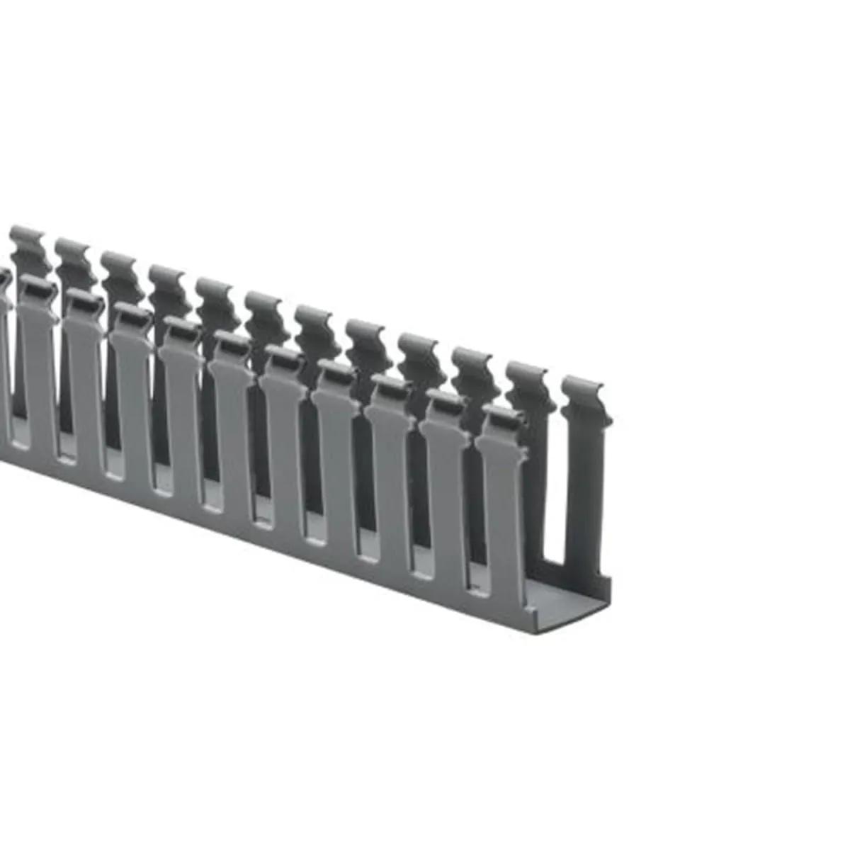 Pro-duct slotted wall wiring duct features break-away fingers which provide additional access for wire leads. Each section of the duct is provided with two score lines. - The upper score line is used to break away fingers when a wider opening is required. The lower score line allows the sidewall to be smoothly cut for joints and "T's".