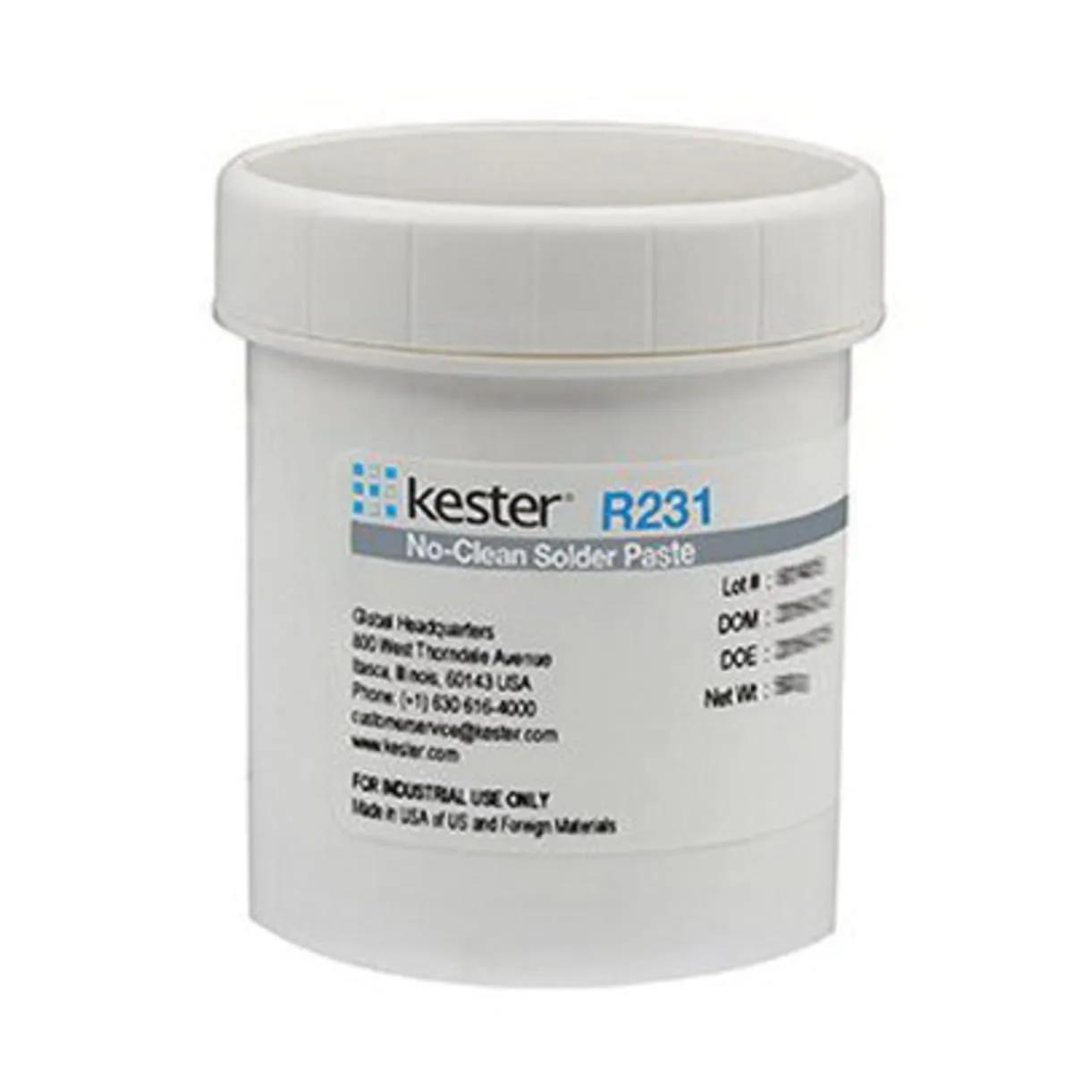 The Kester R231 is a mildly activated rosin (RMA) solder paste formula specifically designed to exhibit long stencil/print life. R231 maintains its activity and printing characteristics for up to 8 hr (temperature and humidity dependent). - Capable of 90 min break times in printing. Compatible with 0201 technology. Contains halogen. Compatible with DEK ProFlow and MPM RheoPump enclosed print head systems.