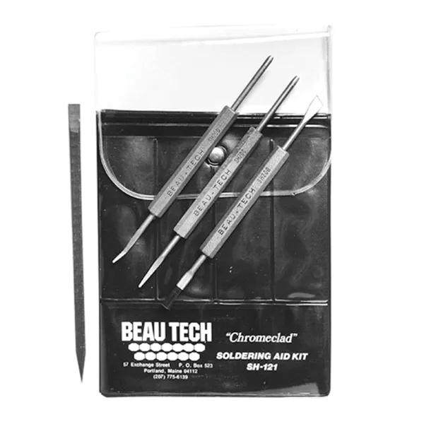 Soldering aid kits contain the most popular Beau Tech tools. The vinyl cases keep the tools clean, handy and safe from damage. The clear vinyl front allows easy selection of the tool to be used. The kits will also keep your work bench more organized. Selection of a kit denotes a true craftsperson and seeker of value. - Beau Tech SH12 is an ESD safe solder aid kit. The stainless steel tools provide sturdy durable working edges.