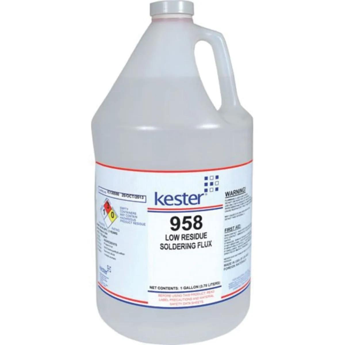 The Kester 958 is a no-clean, non-corrosive liquid flux that is specifically designed for the wave soldering of conventional and surface mount circuit board assemblies. 958 was developed to give excellent soldering performance on bare copper printed circuit boards treated with OSP coatings. Essentially, no residue remains after soldering. A major advantage of this flux is the reduced odor associated with the soldering process. - Boards are dry and cosmetically clean as they exit the wave solder machine, thus posing no interference with electrical testing. 958 has excellent compatibility with most conformal coating products on the market today. This comprehensive formulation possesses improved wetting characteristics and also exhibits superior corrosion inhibiting properties and provides a non-tacky residue.