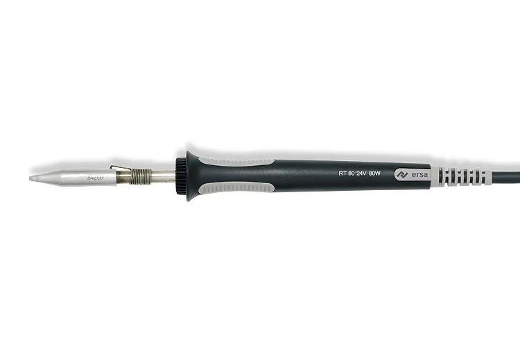 RT 80, 80 W soldering iron for soldering station RDS 80 (1RDS800000A67, 0RDS80. The ceramic PTC heating element (positice temperature coefficient) acts as the temperature sensor in this control system and ensures extremely fast heating thanks to the high initial output. Comes fully equipped with soldering tip 0842CD/SB.