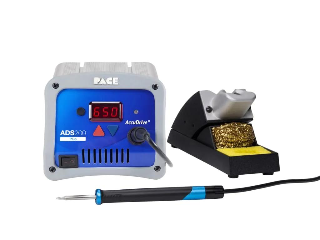 The PACE ADS200 PLUS is a high-power (up to 120 Watts), yet cost-effective professional soldering station designed for electronics technicians, engineers, and production soldering applications. Featuring the TD-200 Tip-Heater Cartridge Soldering Iron with an ergonomic aluminum handle, it ensures comfort during continuous use. The AccuDrive® temperature control technology provides accurate temperatures without the need for calibration, delivering quick heat-up and recovery times. The system includes an Instant SetBack (ISB) Tool Stand, which automatically lowers the tip temperature when the iron is placed in the stand, extending tip life and conserving energy. Its rugged, all-metal construction and ESD-safe design make it suitable for demanding environments.