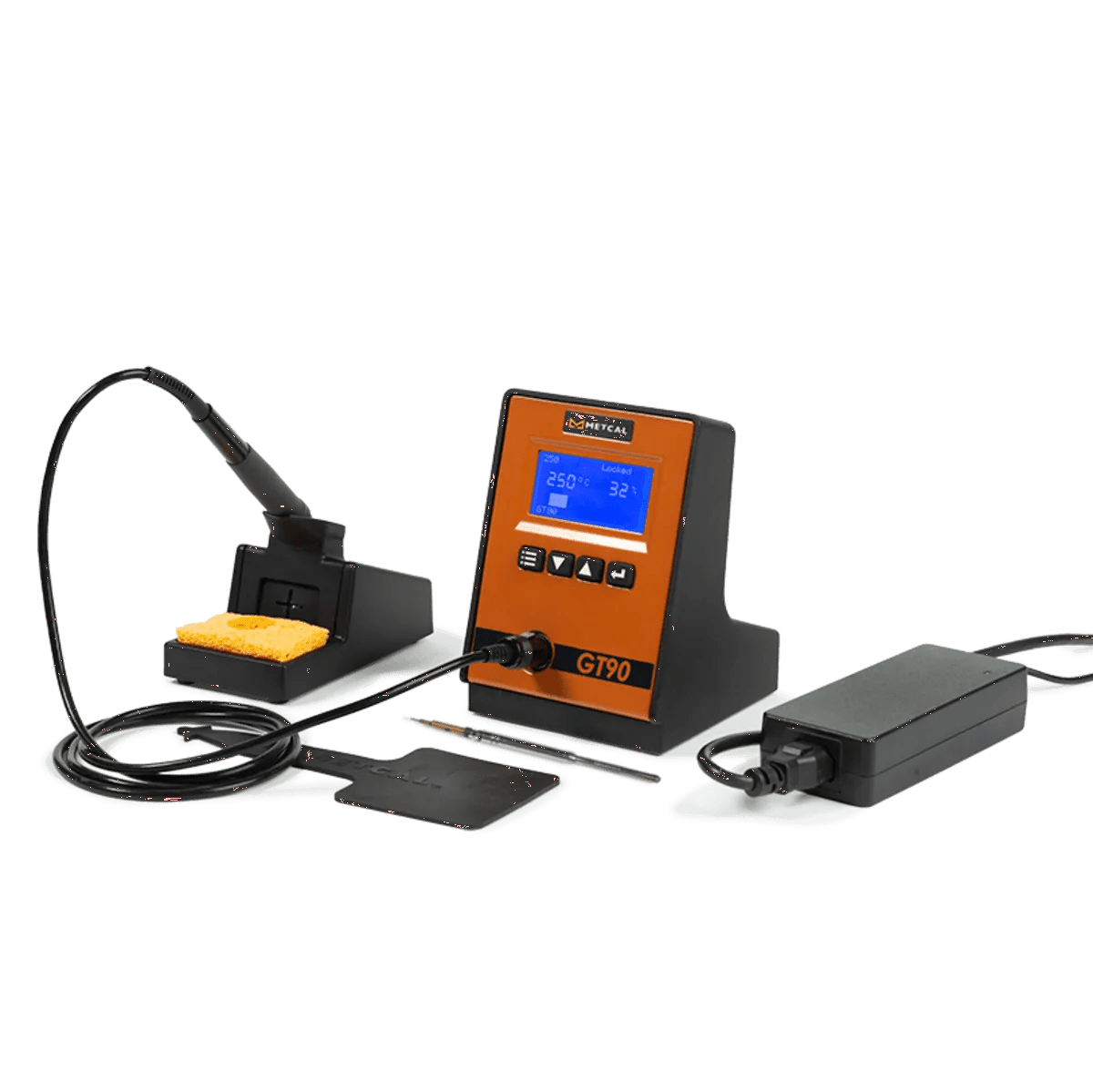 GT90 Soldering System is an adjustable temperature station that uses inductive technology as the heating mechanism. The complete system includes a soldering station with an external Power supply, a hand-piece, and a workstand to support a variety of soldering and rework applications using the associated tips and Cartridges.