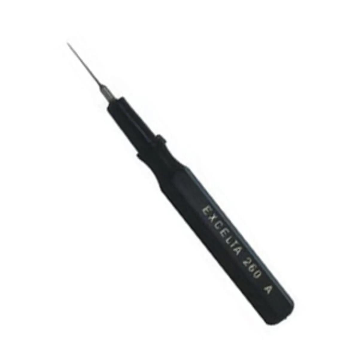 The 260A mini-spatula (oiler) is 2.5" long and has a .010" tip. The tips are made of AISI 1075 Carbon Steel. The handle is plastic and colored black. Mini-spatulas are ideal for placing epoxies or lubricant in very small amounts into tight places.