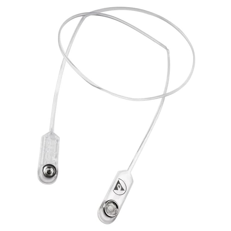 Ideal for use by electronic manufacturers working with ESD sensitive components. Dissipative vinyl 1 x 10⁴ to < 1 x 10¹¹ ohms, per ANSI/ESD STM11.11. Meets ANSI/ESD S20.20 and ANSI/ESD S541. 37” lanyard for short term use. Soft, frosty clear vinyl presents a low profile that doesn't compete with clothing. Strap snaps around the neck and attaches to clip-on or retractable badge holder. With a nominal 15-pound force applied to lanyard it will break. Made in the United States of America.