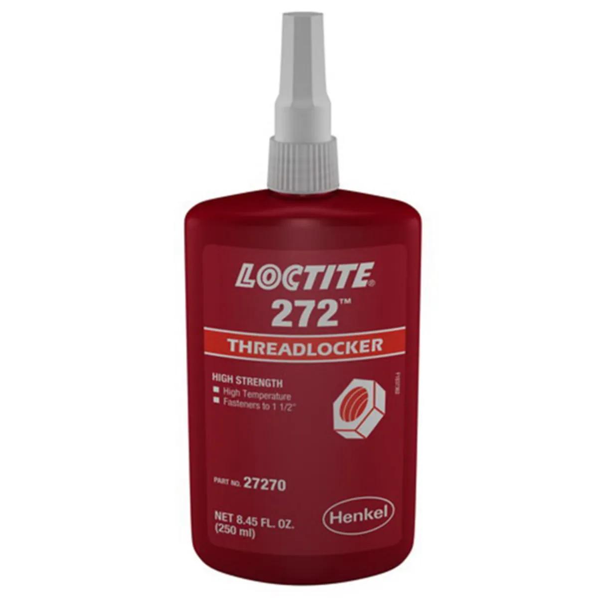 Loctite 272 high temperature, high strength red threadlocker withstands temperatures to 450 °F. Provides a fast cure on most surfaces, including "as received" fasteners. Recommended for bolts up to 1-1/2 Inch (36 mm) in diameter. Heat and hand tools are required for disassembly.