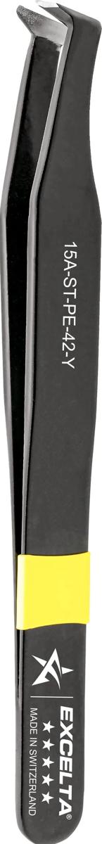 The 15A-ST-PE-42-Y 110° angled wire stripping tweezers designed to strip magnet wire coating exactly to AWG gauge without nicking. It is made of carbon steel with flame hardened edges and coated with an ESD safe (10⁵ - 10⁶ 0hms/sq) epoxy coating to prevent oxidation