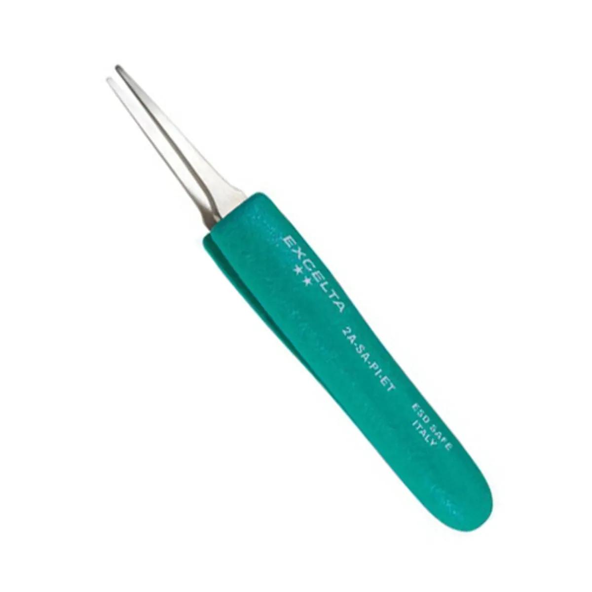 The 2ASAET straight tapered flat tipped tweezer is designed for handling labels or SMD components. It features Ergo-Tweeze ergonomic soft cushioned ESD-safe (10^10 Ohm/sq) grips. - Excelta 2ASA Ergo-Tweeze® Anti-Magnetic Tweezer.