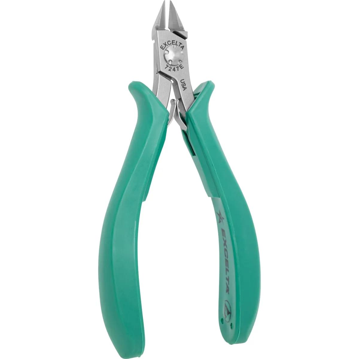 The 7247E Lazer Line®medium tapered/relieved optimum flush cutter has a cutting capacity of .005" - .040" soft wire. It is made of carbon tool steel with induction hardened cutting blades to RHC 63-65. The CNC machining allows the joint surfaces to be perfect to allow for long life. The dual leaf springs provide a smooth action. It features a ergonomically molded antimicrobial Anti-Static grip (10¹⁰ ohms/sq surface resistivity) with dual leaf springs.