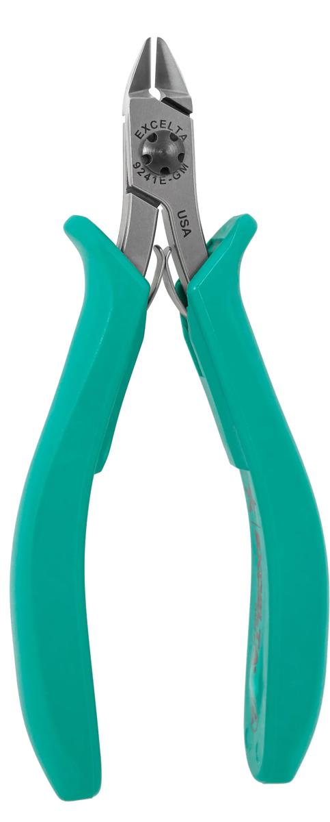 The 9241E-GM Lazer Line® medium oval optimum flush cutter has a cutting capacity of .005" - .040" soft wire. It is made of carbon tool steel with induction hardened cutting blades to RHC 63-65. The CNC machining allows the joint surfaces to be perfect to allow for long life. The dual leaf springs provide smooth action. The Anti-Static grips are ergonomically molded and have a surface resistivity of 10¹⁰ ohms/sq.