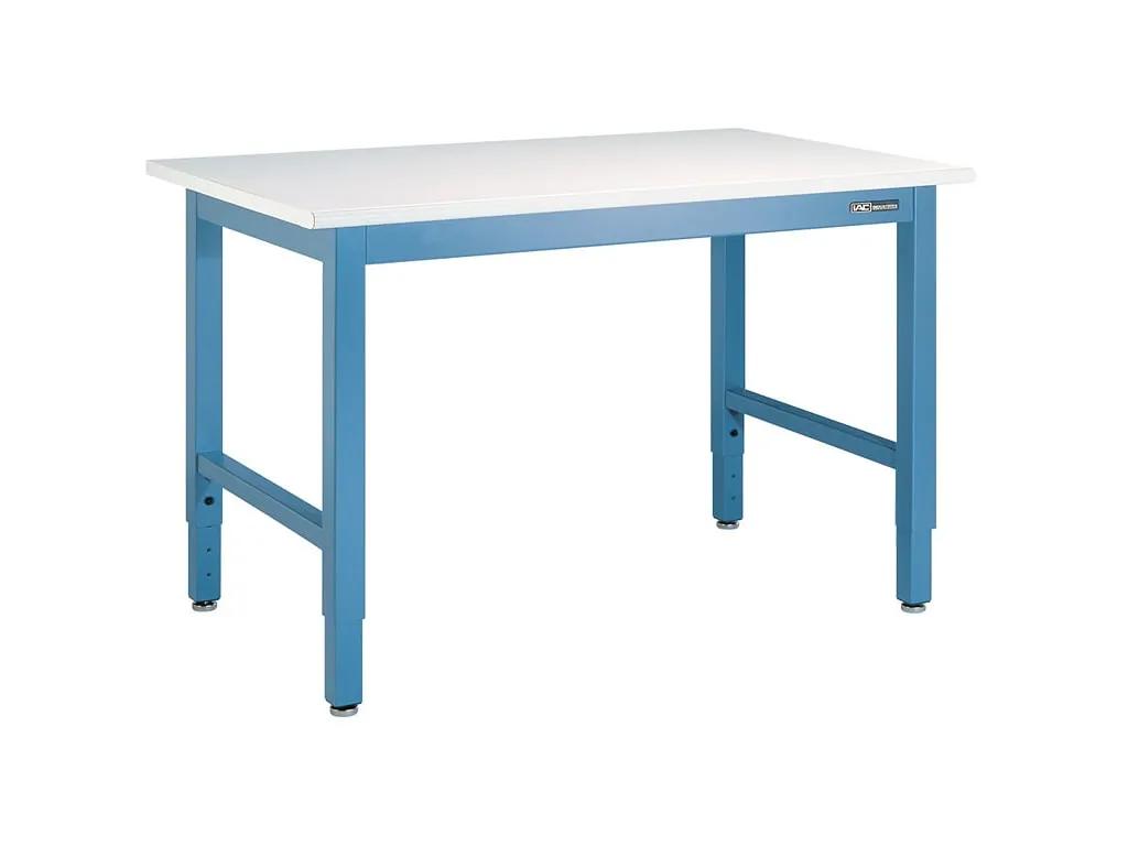 The IAC Industries QS-1000005-D Workmaster Workbench offers industrial-grade strength with a 1000 lbs distributed load capacity and adjustable height from 30" to 36". Its heavy-duty steel frame and standard laminate top ensure durability in demanding environments, ideal for electronics assembly, light manufacturing, or general industrial use. Featuring a powder-coated finish and 180° rolled front edge for comfort and safety, this bench is built for performance. Finished in a clean Sky Blue, it suits a wide variety of professional workspaces.